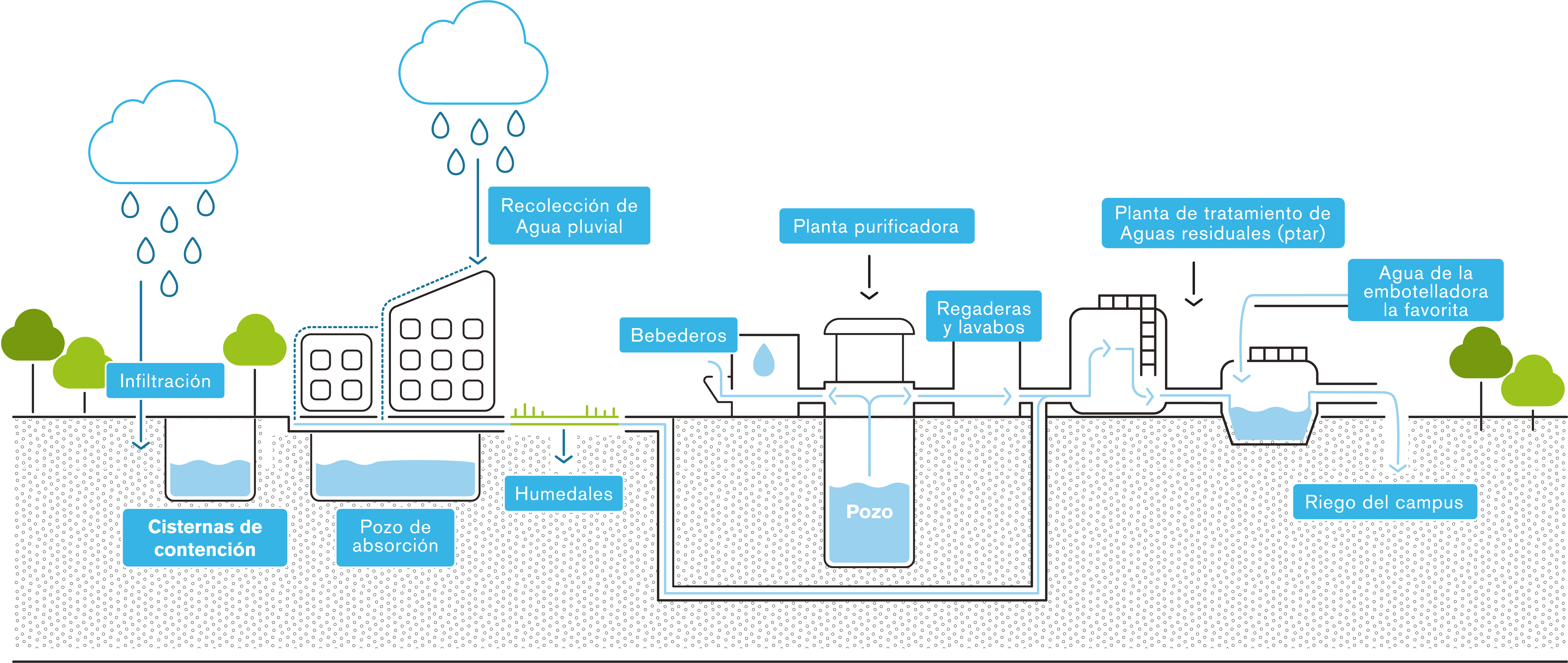 Como parte de los esfuerzos por reducir el uso de agua potable, la Universidad ha establecido una colaboración con la planta de producción de Embotelladora La Favorita para recibir agua tratada de sus procesos, misma que, una vez tratada en la planta del campus, también se reusa. Esta iniciativa contribuye a hacer un uso más eficiente de los recursos hídricos y a cuidar el medio ambiente al aprovechar agua tratada en actividades no potables más allá del campus.